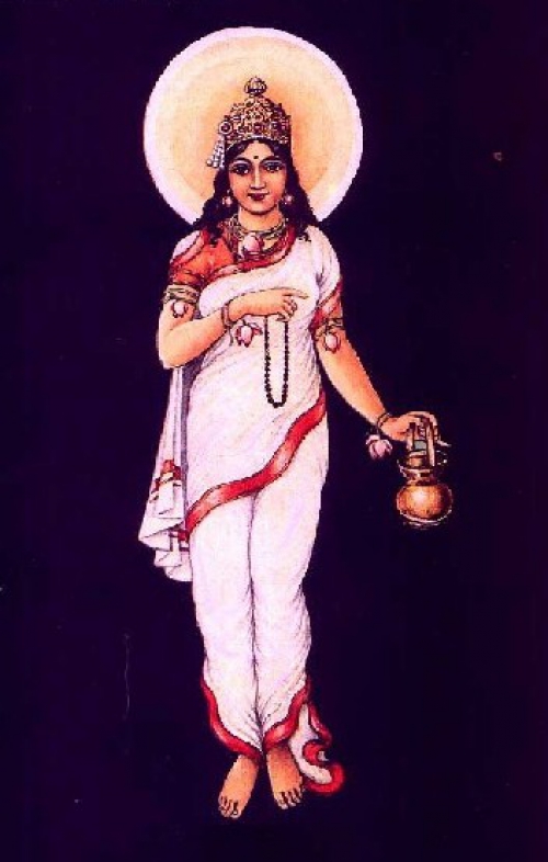 She has a garland of worship in her right hand and Auspicious Bowl (Kamandal) in left hand.